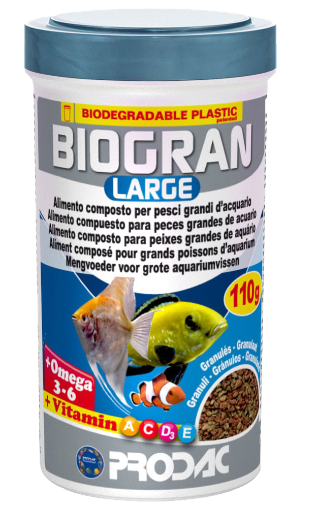RACAO PRODAC TROPICAL gANULES g (BIOgAN LARGE) 110g - RACAO PRODAC BIOgAN LARGE 110g Alimento composto em ganulado para peixes de água doce e salgada de tamanhos gande, particularmente adaptado para os ciclideos. Composição: peixes e derivados de peixes, cereais, soja, crustáceos, fermentos, legumes e algas. Perfil Nutricional: Aditivos nutricionais: Vitamina A 41.500 I.U./kg, Vitamina D3 1.600 I.U./kg, Vitamina C 274 mg/kg, Vitamina E 267 mg/kg. Constituintes analíticos: proteínas brutas 43,50%, cinzas brutas 8,73%, gorduras brutas 5,49%, fibras brutas 4,01%, umidade 4,13%, Ômega 6 20,30%, Ômega 3 8,49% . Dimensões Embalagem: 11,5cm x 6,2cm x 6,2cm 147g (biogran. Granules. Fórmula balanceada que promove saúde, crescimento e cores vibrantes nos peixes. Composição premium que favorece a estabilidade química e o crescimento de corais.
